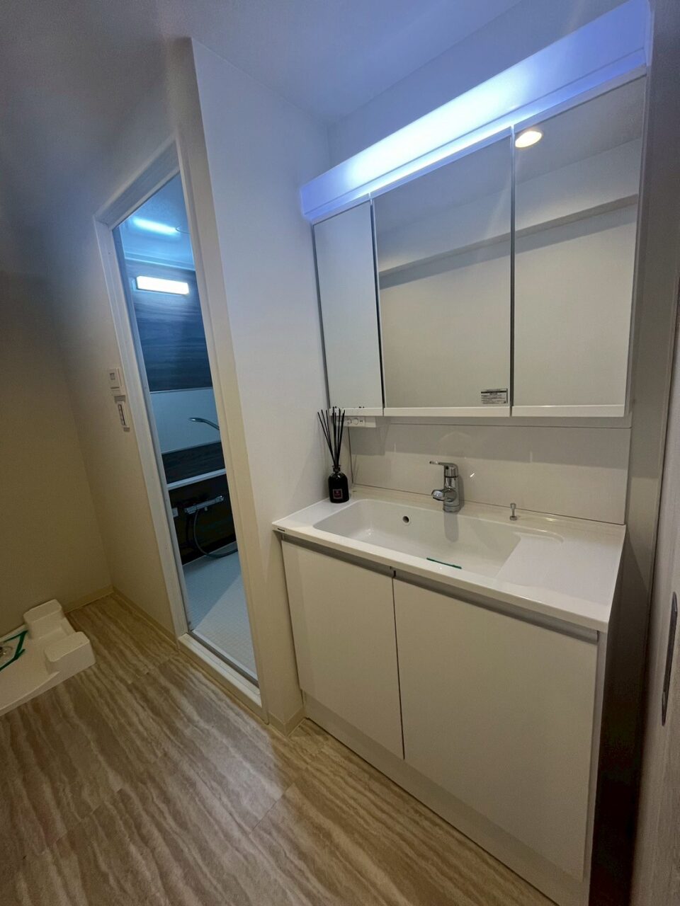洗面台 :三面鏡付洗面化粧台交換(パナソニック社製シーラインW900)